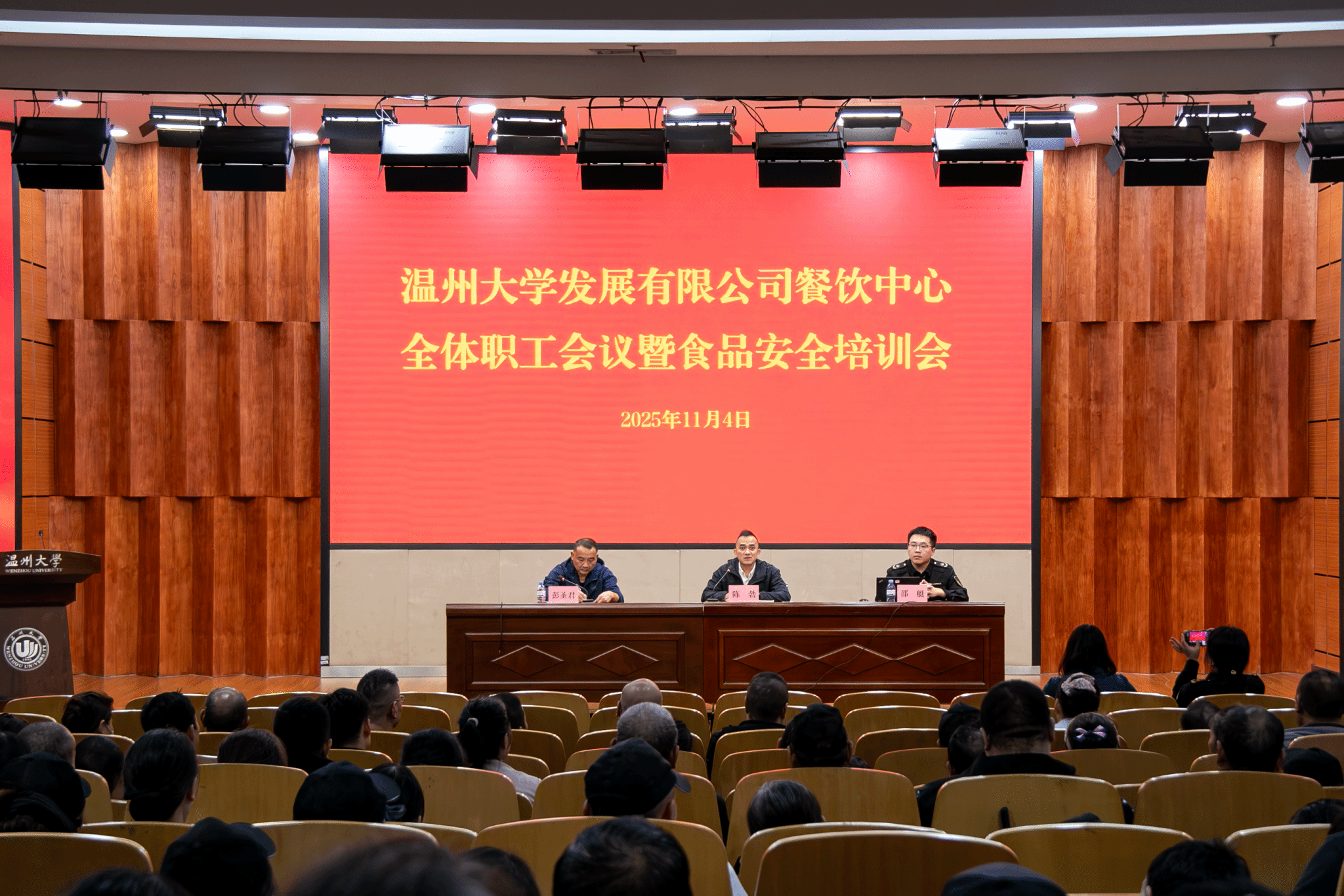 为强化餐饮员工食品安全责任意识,提升公司餐饮业务经营管理能力,2025年11月4日下午,温州大学发展有限公司组织召开餐饮中心全体职工会议暨食品安全培训会在岩松堂雁山厅召开,公司总经理、党总支书记陈勃出席会议,二百多名餐饮员工参加会议。会议由分管餐饮工作的公司副总经理彭圣君主持。会上,瓯海区茶山街道市监所邵艇同志受邀开展食品安全专题培训。