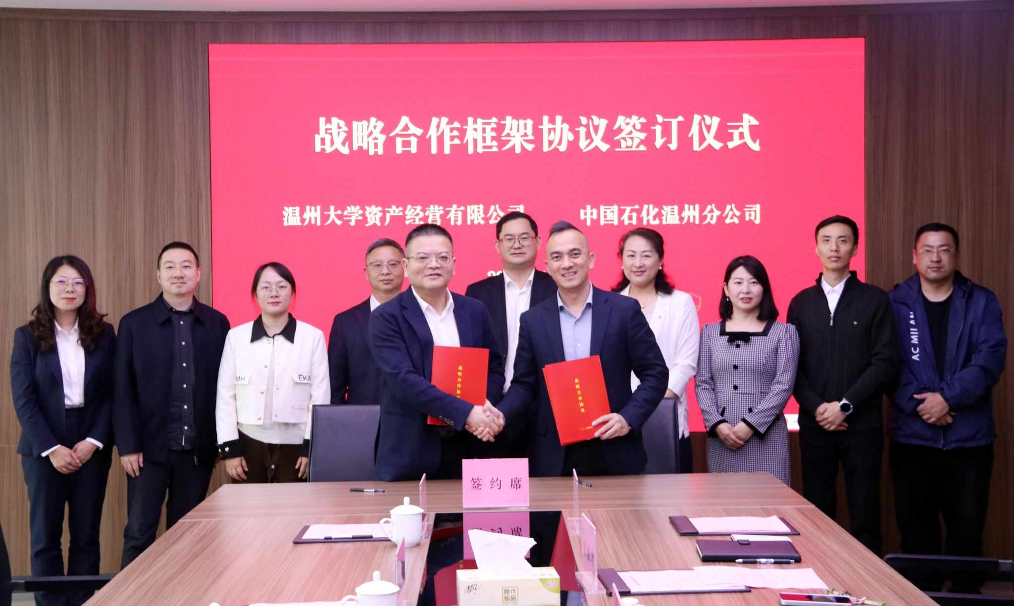 2026年4月8日下午,温州大学资产经营有限公司与中国石化温州分公司战略合作签约仪式在温州大学科技综合大楼举行。温州大学副校长、党委委员王军,中国石化温州分公司党委书记周雄江、总经理周云峰,资产公司领导班子成员及双方相关部门负责人出席仪式。仪式由温州大学资产经营有限公司党总支副书记张丽君主持。