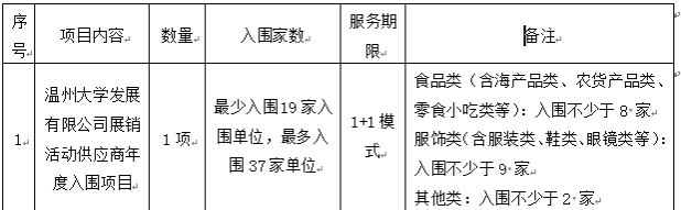 参照有关规定,温州市圣励招标代理有限公司受温州大学发展有限公司委托,就温州大学发展有限公司展销活动供应商年度入围项目进行竞争性磋商,欢迎国内合格的供应商前来磋商。