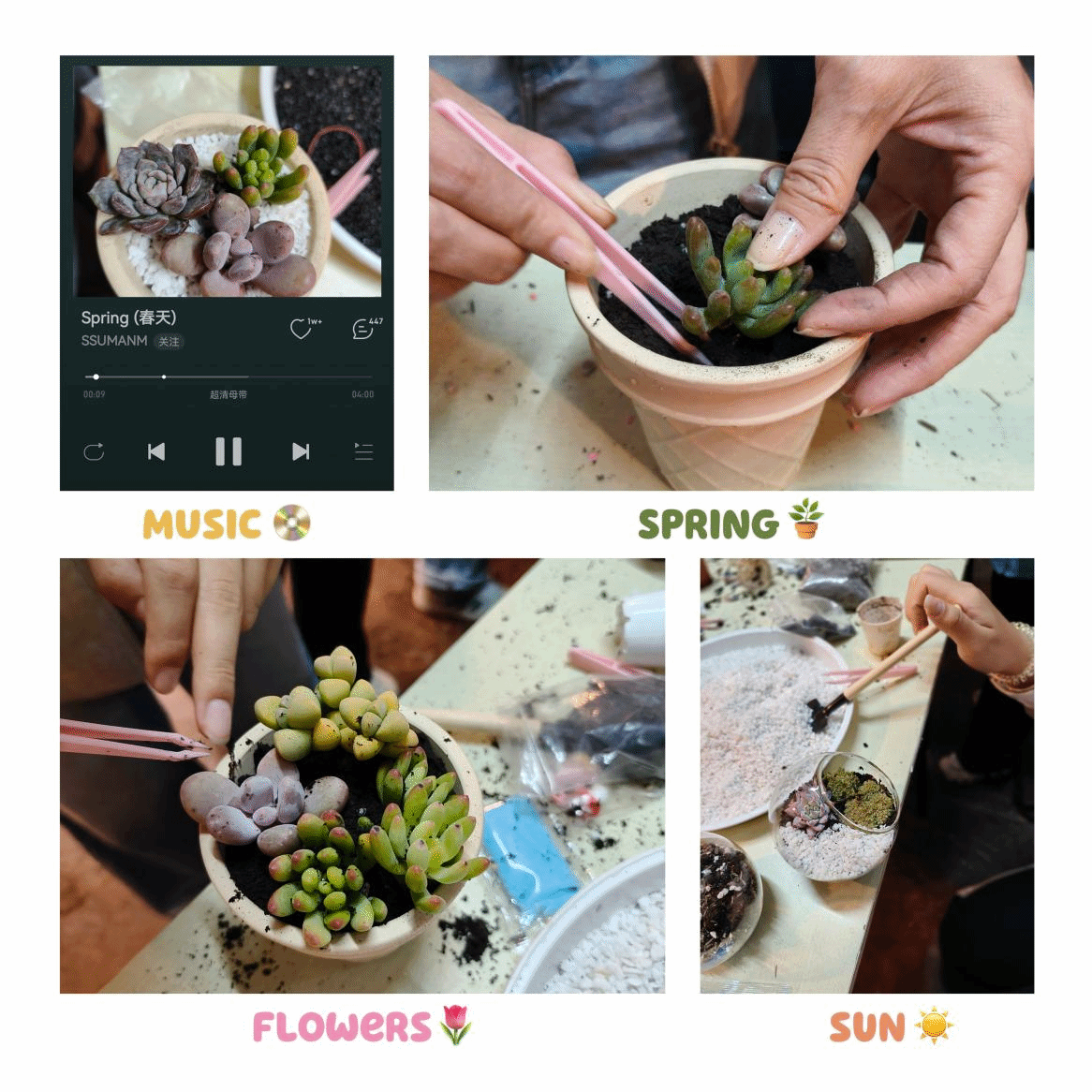 活动当天虽遇大雨,但丝毫没影响师生们的参与热情。活动现场,绿植DIY环节成为人气焦点。苗圃贴心提供全套制作材料,同学们用创意搭配绿植生机,亲手打造独一无二的多肉盆栽,沉浸式体验手工创作的乐趣。