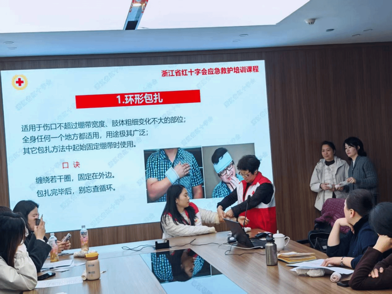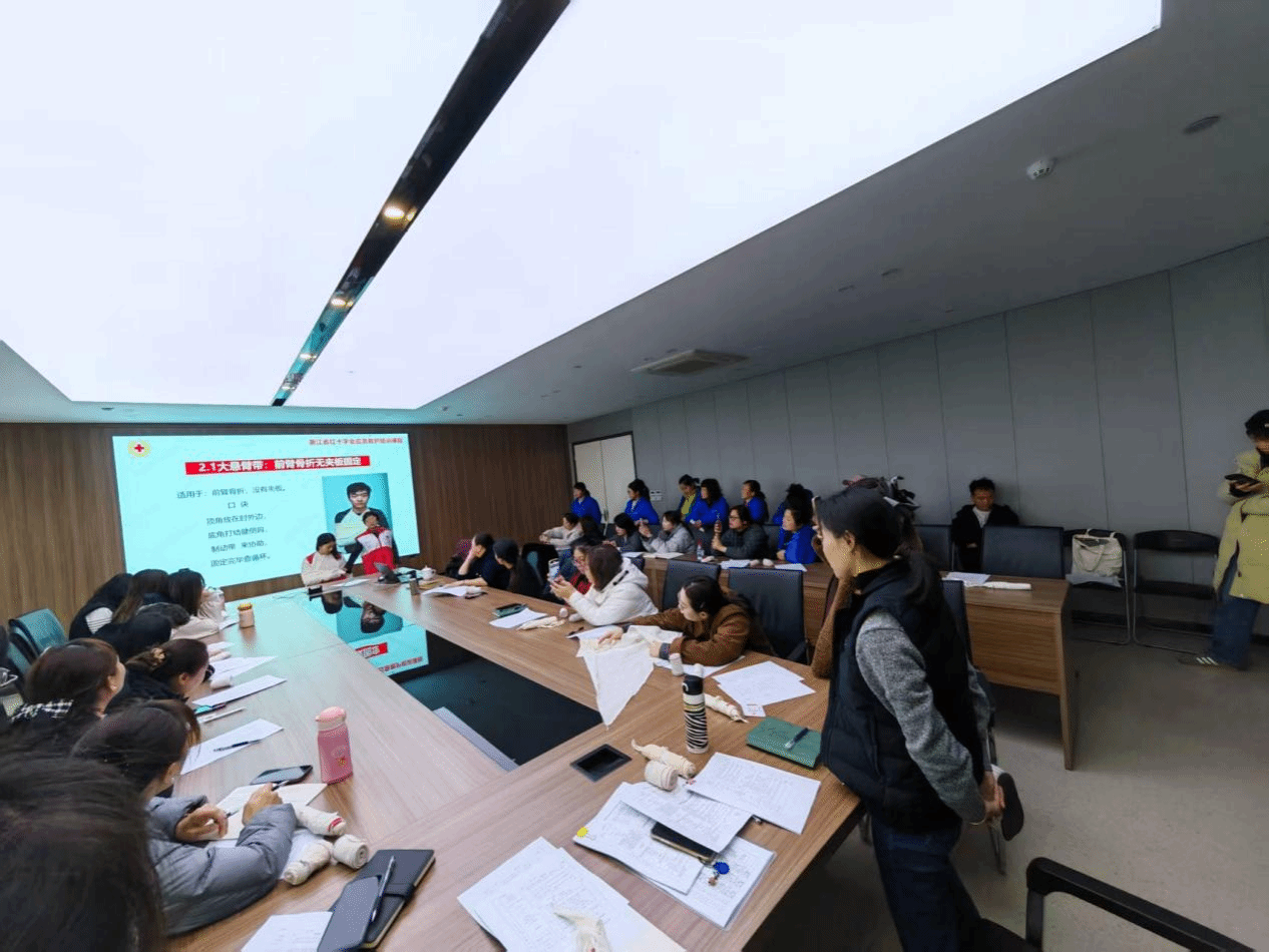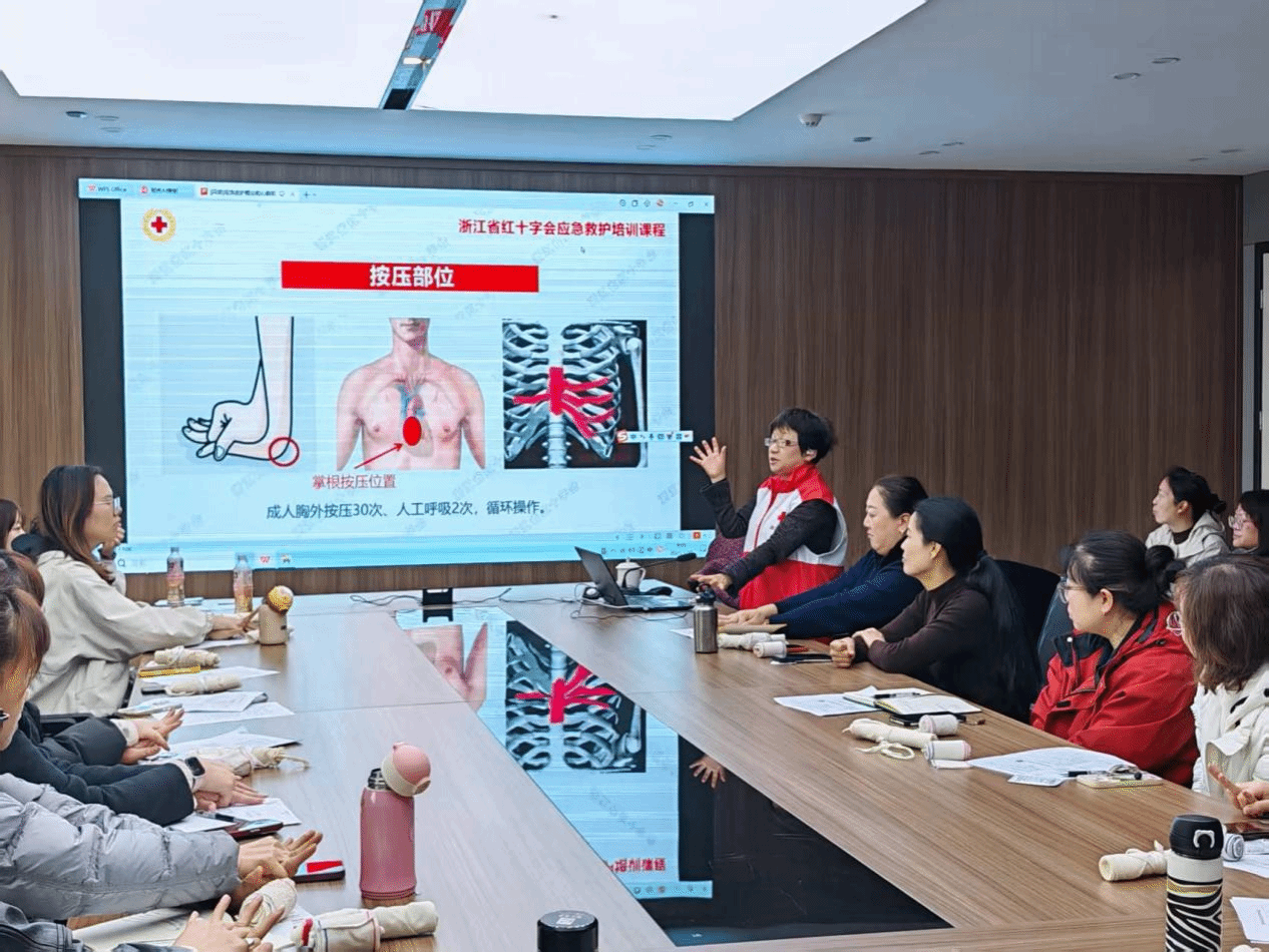培训特邀浙江省红十字会专业讲师姜文莉老师主讲,以“理论+演示”的形式,为职工们系统讲解核心急救知识:如重点解读心肺复苏“黄金4分钟”的重要性,通过数据图表直观展示“急救越早,成功率越高”的规律,让职工深刻认识到及时施救的关键意义。细致拆解胸外按压部位、开放气道手法、AED操作流程等核心要点,结合人体解剖图与模拟演示,将抽象知识转化为清晰可学的操作规范;同时围绕创伤包扎、气道异物梗阻急救等场景,梳理实用口诀与操作步骤,现场互动热烈,职工们认真记录、踊跃提问,学习氛围浓厚。