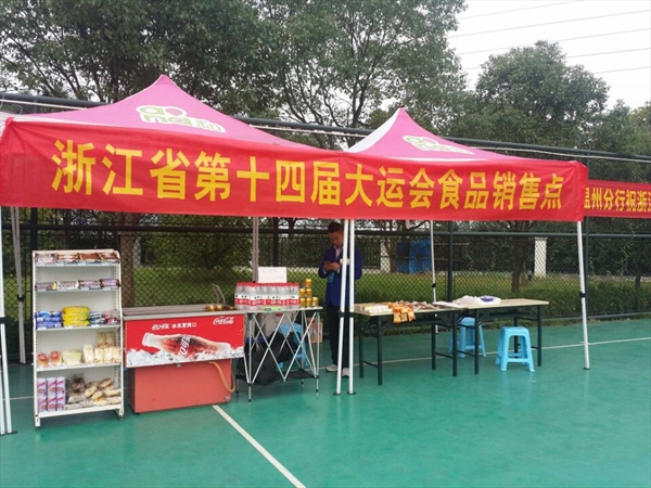大运会期间天公不作美,一直刮风下雨,但是商贸中心从未停止过服务与奉献。在篮球场地,商贸中心商场专门设点售卖各种食品、饮料等。运动员和志愿者如果饿了可以到我们这里买面包,要是渴了我们也有提供矿泉水和其他无机饮品,巧克力和红牛饮料可以让运动员能量满满地展示出最有力的自己。