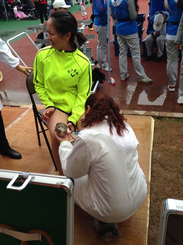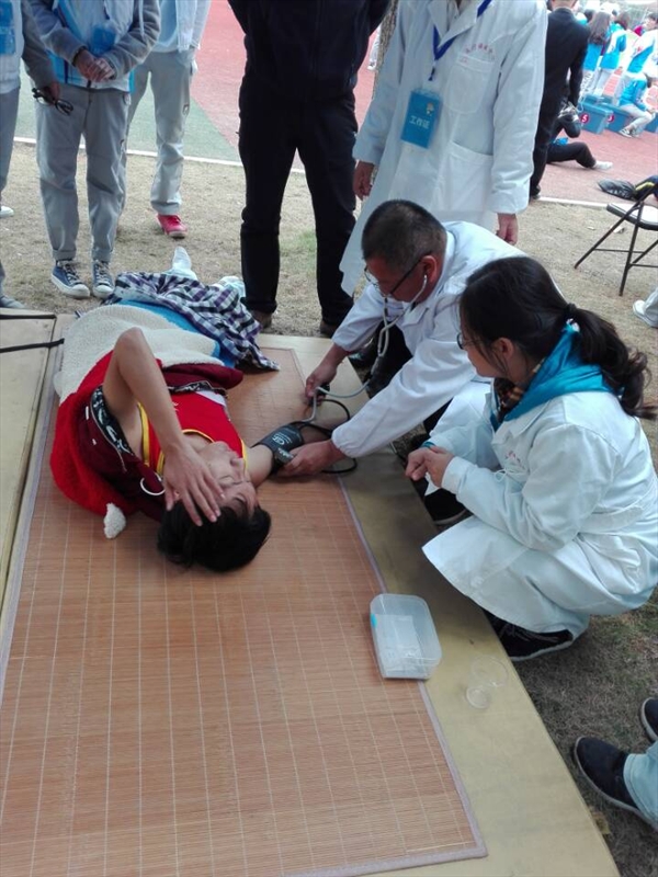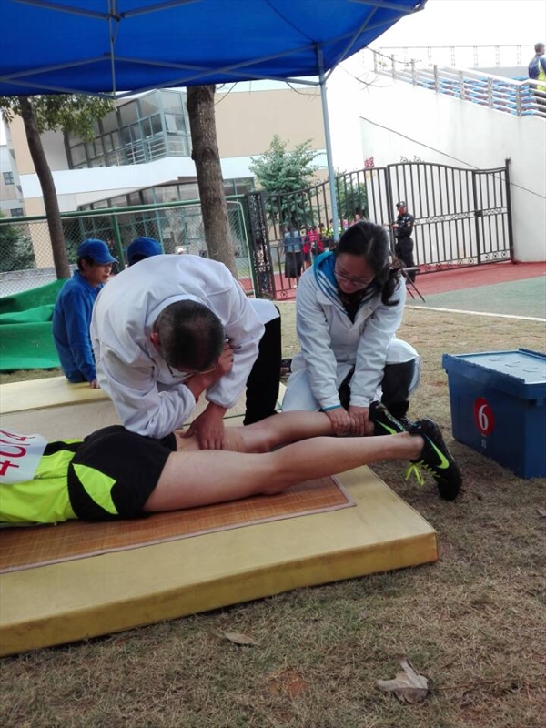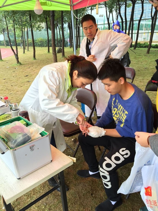 运动场上,赛事精彩纷呈,运动健儿们充分发挥不屈不挠、顽强拼搏的精神,在赛场上弘扬个性与青春活力。运动场下,医疗小组牢记自己的职责和任务,工作人员身穿白大褂每天准时到岗,在淅淅秋雨和凛冽冷风中坚守在赛场上至最后一刻为轻伤运动员进行简单的伤口清洗、止血包扎,提供必要的应急药品如酒精棉球、创口贴、云南白药喷剂、止痛药等;做好急重伤同学紧急处理和迅速转校医务室或医院治疗;向运动员宣传基本的防护措施,避免其在运动中受伤以及受伤之后的应急处理,让运动员在寒冷的赛日里感受到温暖。在医疗服务过程中,医疗小组成员以专业的技能、极大的细心和耐心赢得了全体参赛人员的一致好评,解决了运动员的后顾之忧。