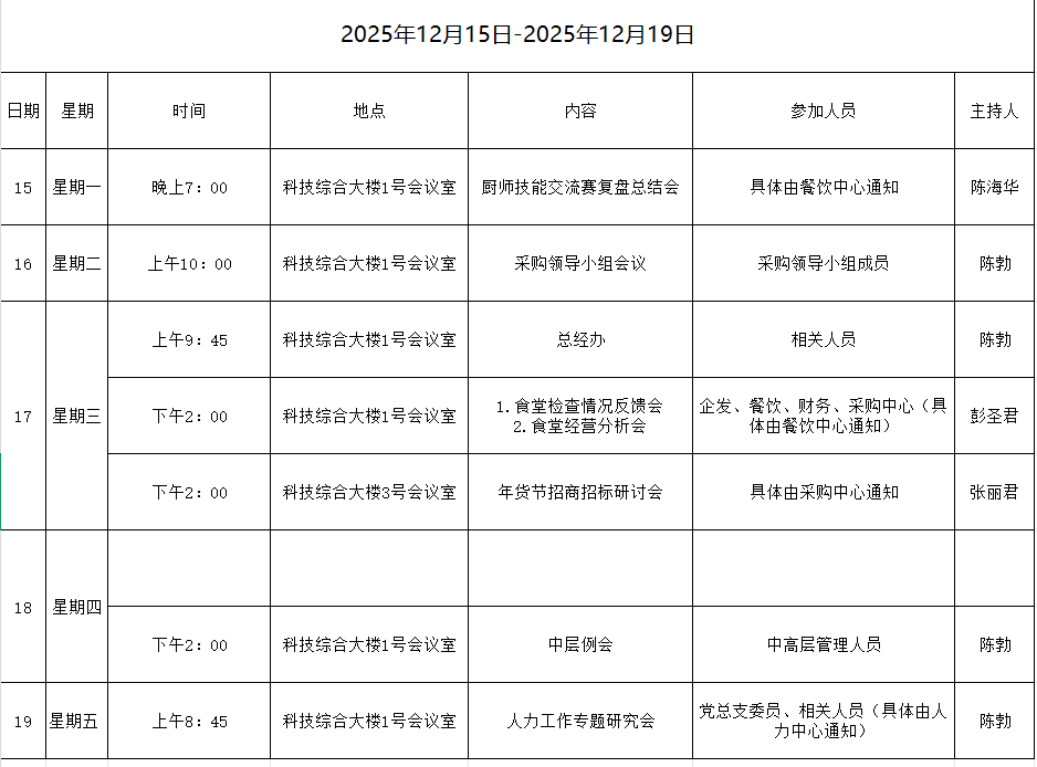 资产公司(发展公司)第15周会议安排(2025年12月15日至2025年12月19日)