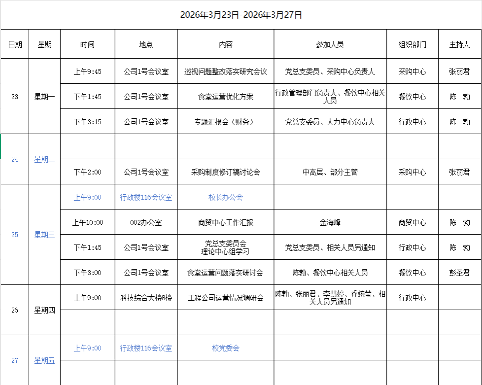 资产公司(发展公司)第4周会议安排(2026年3月23日至2026年3月27日)