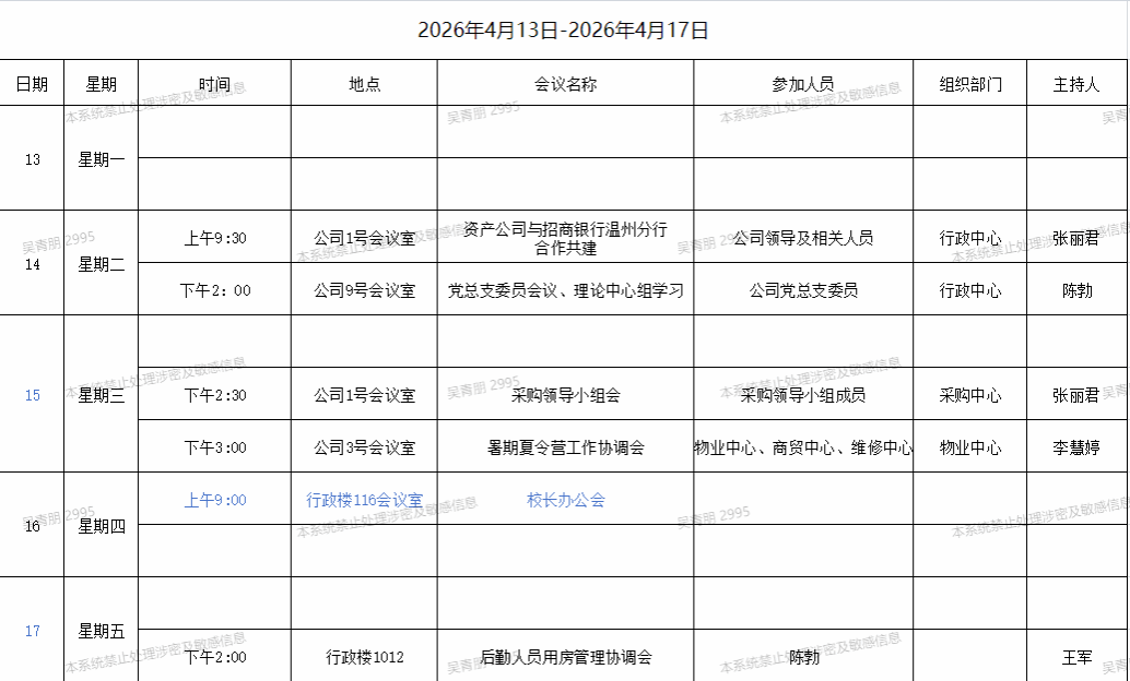 资产公司(发展公司)第7周会议安排(2026年4月13日至2026年4月17日)